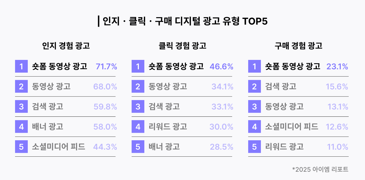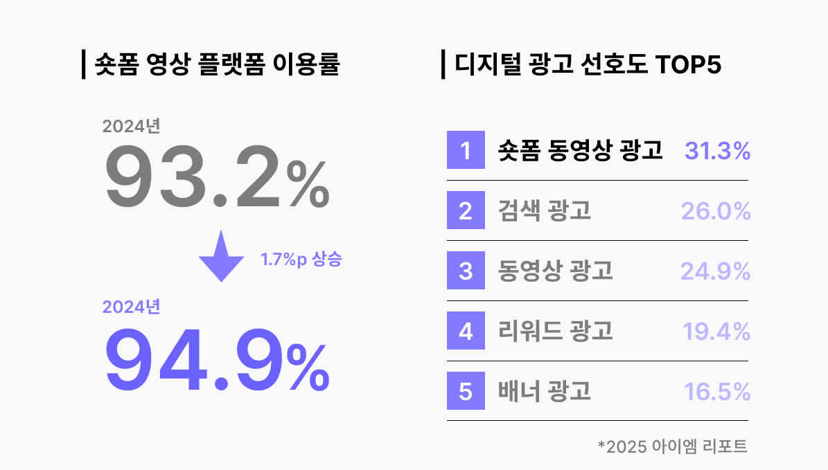 2025 ์์ด์ ๋ฆฌํฌํธ์ ๋ฐ๋ฅด๋ฉด ์ํผ ์ด์ฉ๋ฅ ์ ์ ๋ ๋๋น 1.7%p ์์นํ 94.9%๋ก ์ฌ์ค์ ๋ชจ๋๊ฐ ๋ณด๋ ํฌ๋งท์ด ๋์์ฃ . ๋ฟ๋ง ์๋๋ผ ๋์งํธ ๊ด๊ณ ์ ํธ๋์์๋ ์ํผ ๋์์ ๊ด๊ณ ๊ฐ 31.3%๋ก 1์๋ฅผ ์ฐจ์งํ์ต๋๋ค.