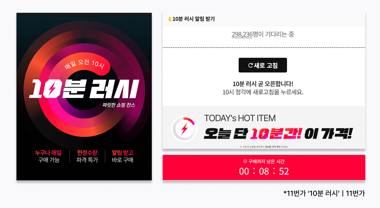 11번가는 하루 딱 10분 동안 한정 특가 상품을 판매하는 ‘10분 러시’를 운영하며 9개월 만에 누적 거래액 110억 원을 달성했습니다. 제한된 시간 동안 진행되는 판매는 소비자들의 즉각적인 참여를 유도하며 알림 신청 수만 28만 명에 달할 정도로 큰 관심을 얻었죠.