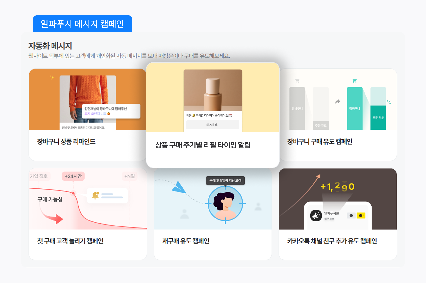 μννΈμ βμν ꡬ맀 μ£ΌκΈ°λ³ λ¦¬ν νμ΄λ° μλ¦Όβμ κ³ κ°μ μ¬κ΅¬λ§€ μκΈ°μ λ§κ² μλμΌλ‘ νΈμ λ©μμ§λ₯Ό μ μ‘ν μ μλ κΈ°λ₯μ λλ€. μν ꡬ맀 ν μ¬κ΅¬λ§€λ₯Ό νμ§ μμ κ³ κ°λ€μ λμμΌλ‘ λ©°μΉ λ€ μΊ νμΈ μ μ‘μ μ€μ ν΄ λλ©΄ κΈ°κ°μ λ§μΆ° μλμΌλ‘ λ©μμ§κ° λ°μ‘λΌμ. μ΄μμκ° λ§€λ² κ³ κ°λ³λ‘ ꡬ맀 λ΄μμ νμΈνκ±°λ νΉμ μνκ΅°μ μλμΌλ‘ λΆλ₯ν΄ μλ¦Όμ 보λ΄μ§ μμλ λλ€λ μ μμ μ 무 λΆλ΄μ ν¬κ² μ€μ¬μ€μ.