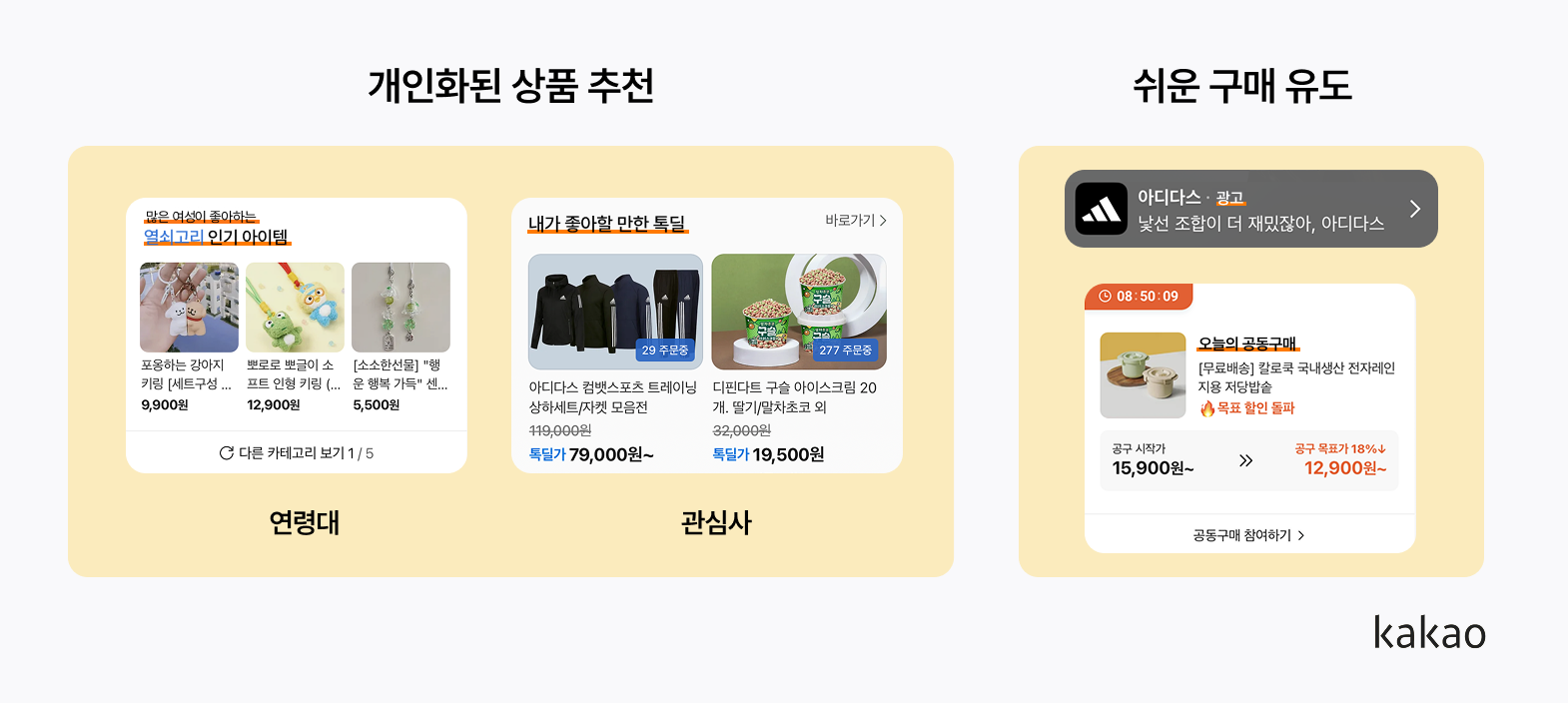 바로 참여 가능한 쇼핑라이브 & 인플루언서 협업 광고 카카오톡에서 즉시 참여할 수 있는 쇼핑라이브와 인플루언서 협업 광고, 그리고 카카오톡 추천 아이템까지 구매여정이 한번에 이뤄지도록 연결지었어요.