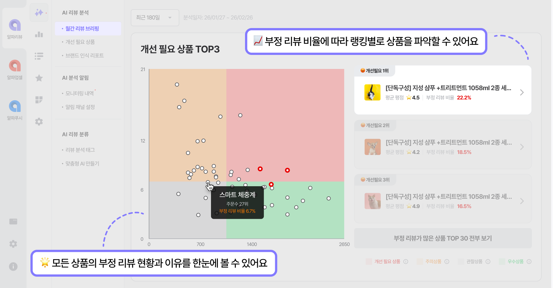 판매량과 부정 리뷰 비율을 결합한 사분면 차트를 제공합니다. 어떤 상품의 품질을 먼저 개선해야 할지, 어떤 상품의 프로모션을 중단해야 할지 AI가 랭킹별로 우선순위를 제안합니다.